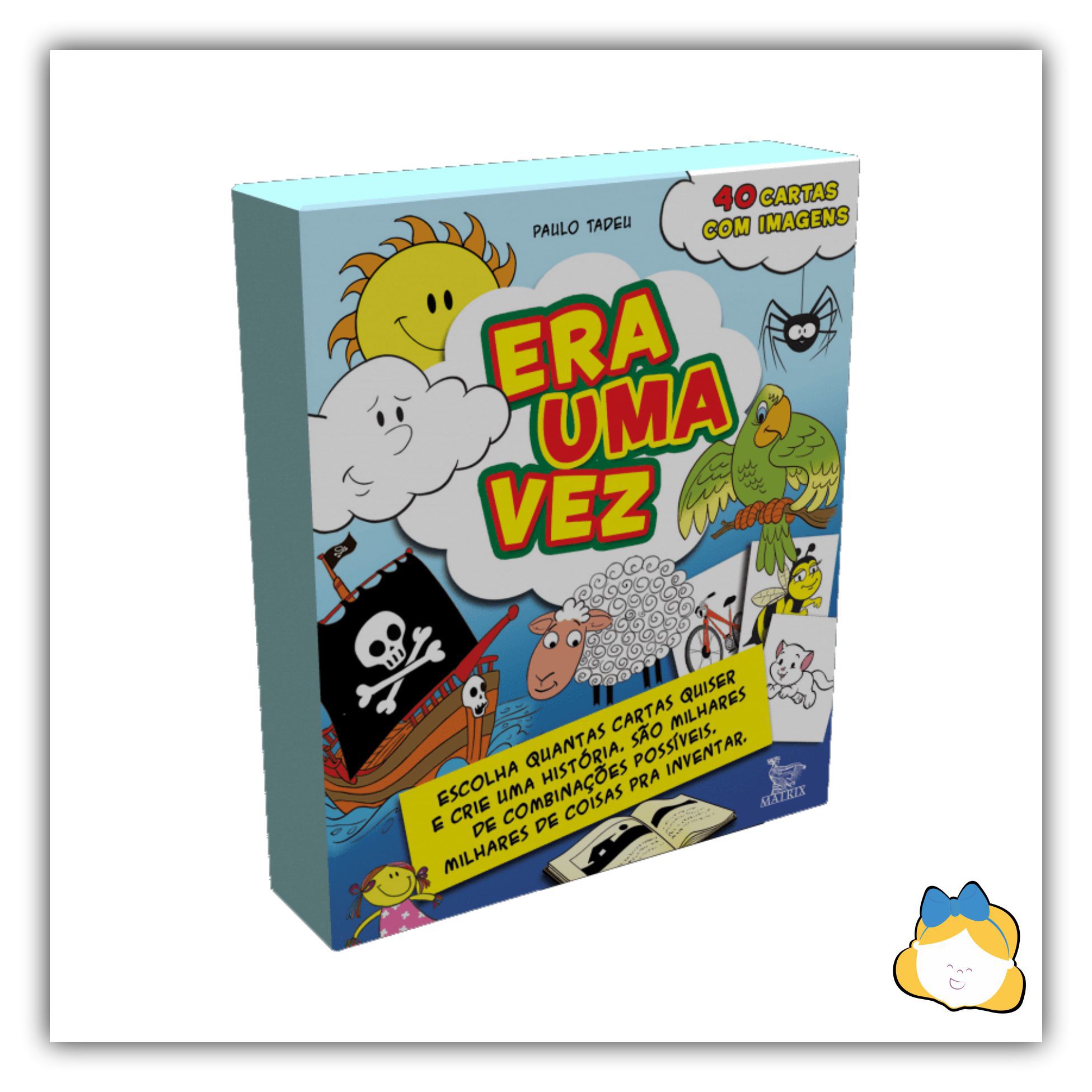 Neste livro em forma de caixinha estão 40 cartas, cada uma com um desenho. Pegue quantas cartas quiser e peça para a criança montar uma história. Pode ser na ordem em que os desenhos escolhidos aparecerem ou não. Não tem regra.